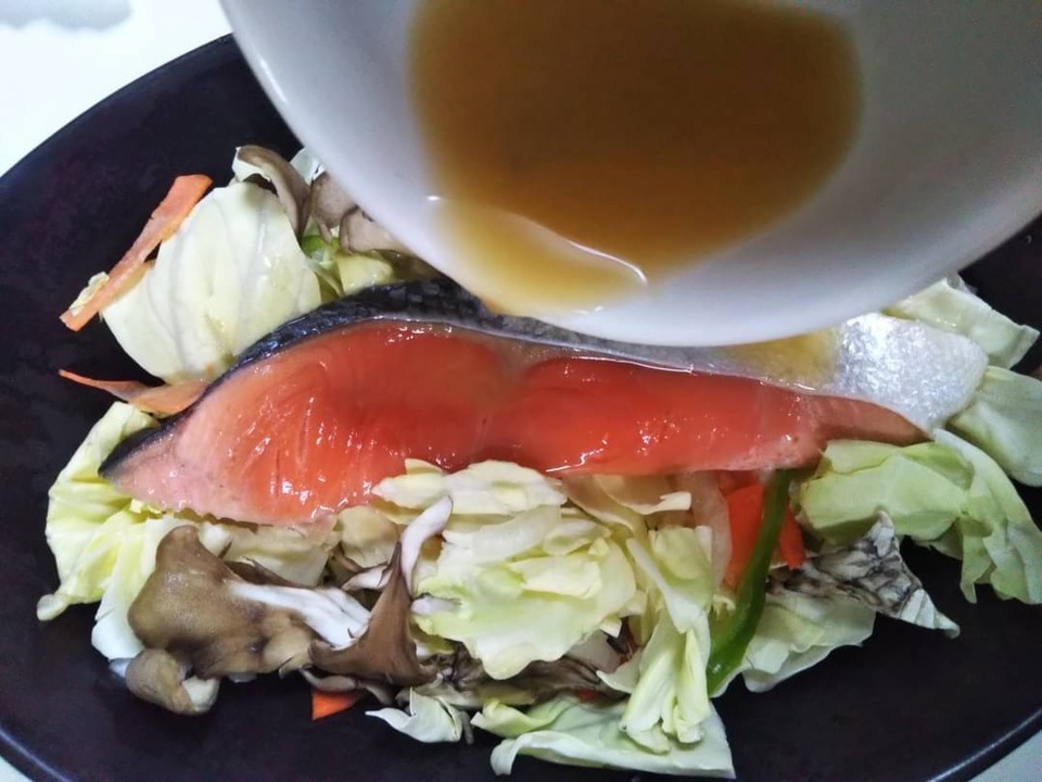 ①カットキャベツミックスを耐熱皿に置き、舞茸を割いて乗せ、鮭をのせる。その上にお酒をふりかけてレンジ600Wで2分加熱する。