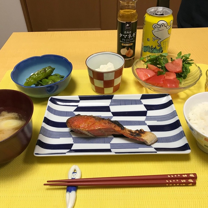 野菜はトマトサラダとしし唐の煮浸し、大根おろし、お味噌汁の具の長葱で、だいたい両手いっぱい。